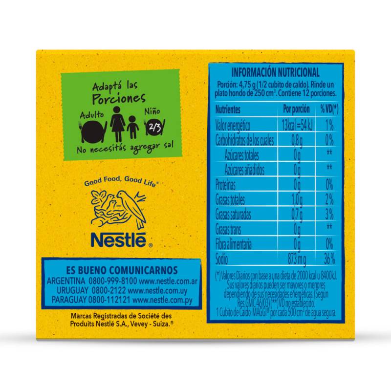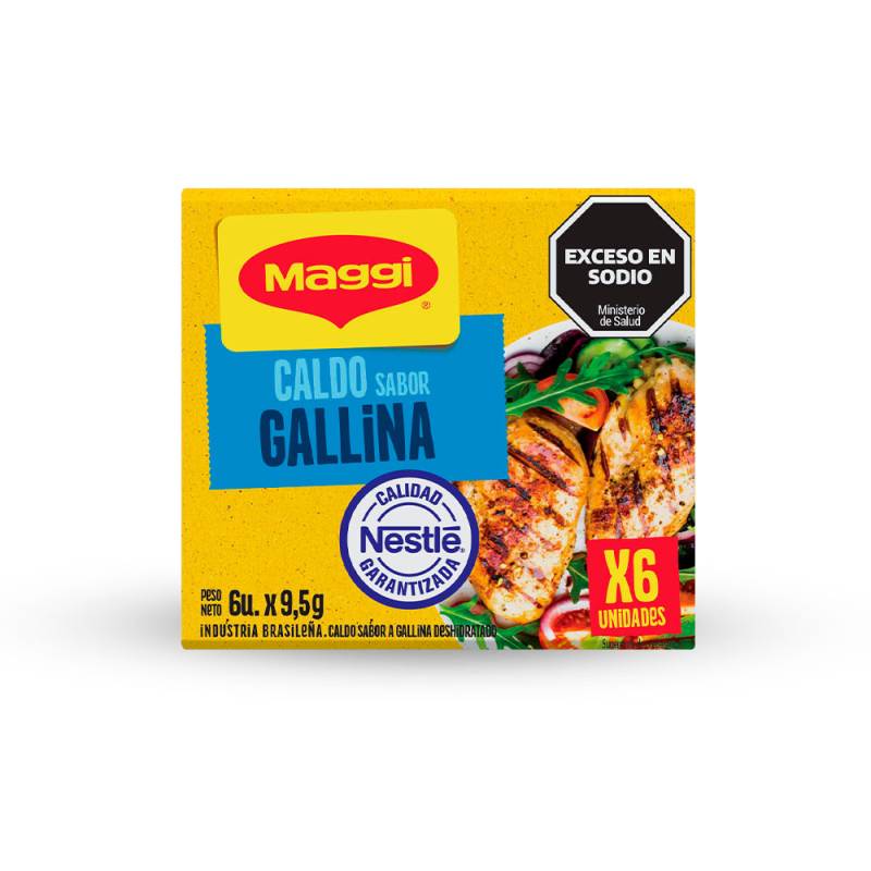 Presentación: 6 unidades x 9,5gr Caldo MAGGI - Sabor GALLINA. Los caldos MAGGI son la alternativa ideal para todas tus comidas. Incorporalos en sopas, guisos, verduras, pastas, salsa, arroz y muchos otros platos para darle cuerpo y sabor a tus preparaciones. Lográ platos más ricos, saludables y con un nivel muy bajo en sodio. ¡Probá nuestros caldos MAGGI en todos sus sabores y descubrí que no pueden faltar en tu cocina!