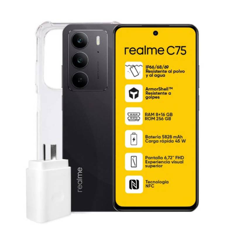 Los accesorios incluyen Funda, Cargador y Cable USB.