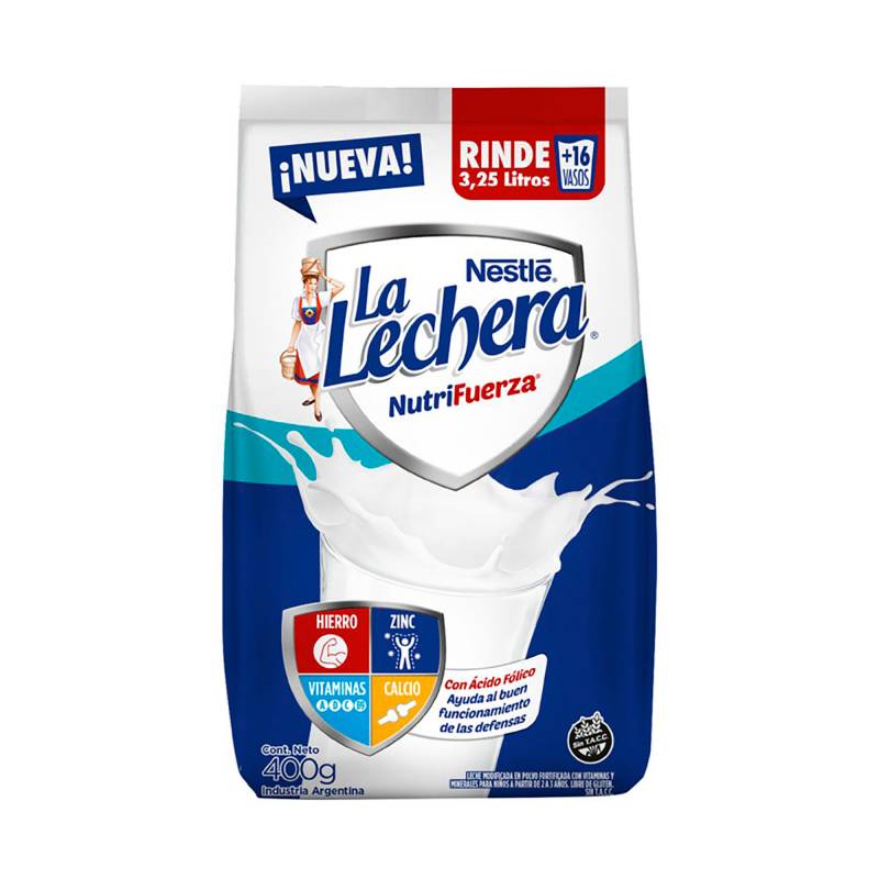 Unidad: Softpack de 400 gramos Leche modificada en polvo con vitaminas y minerales para niños a partir de 2 a 3 años. Libre de gluten. La Lechera NutriFuerza contiene nutrientes esenciales para ayudar a cubrir los requerimientos nutricionales de los chicos. Está fortificada en vitaminas y minerales ayudando a mantener las defensas:
