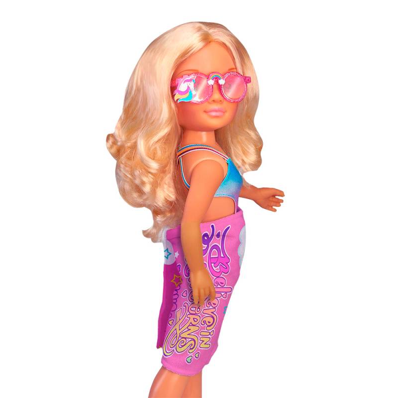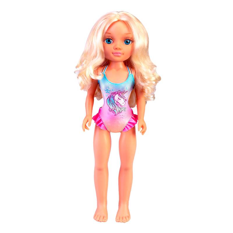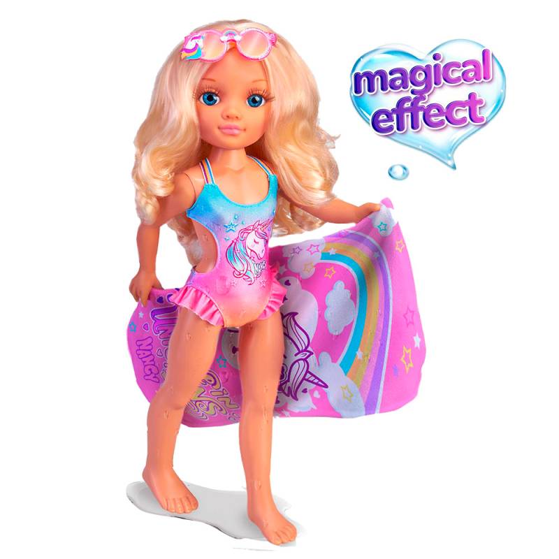 Nancy - Un Dia con Toalla Mágica- Muñeca con traje de baño, lentes y una toalla mágica. Cuando se moja aparece un unicornio. Pelo es largo y ondulado y viste una malla de unicornio con volados y anteojos de sol con purpurina tipo glitter .Muñeca de 42 cm
