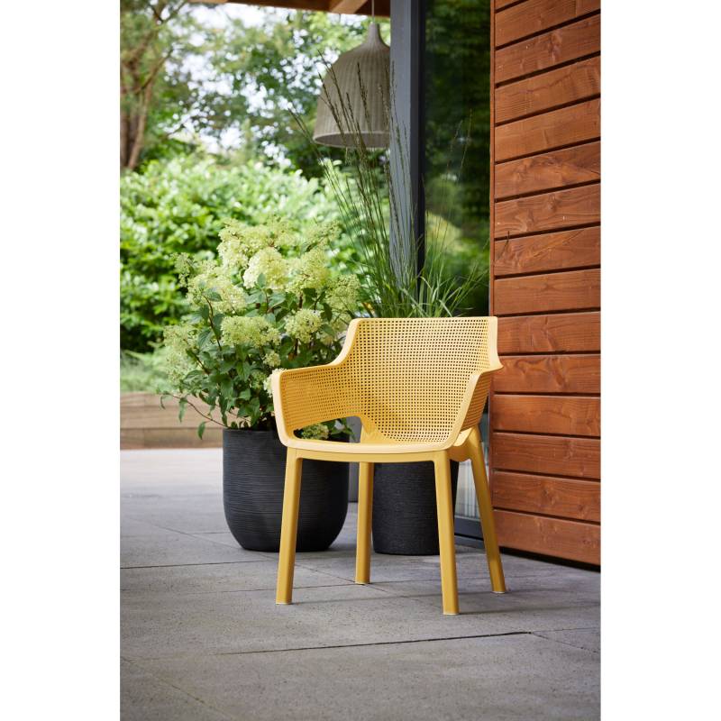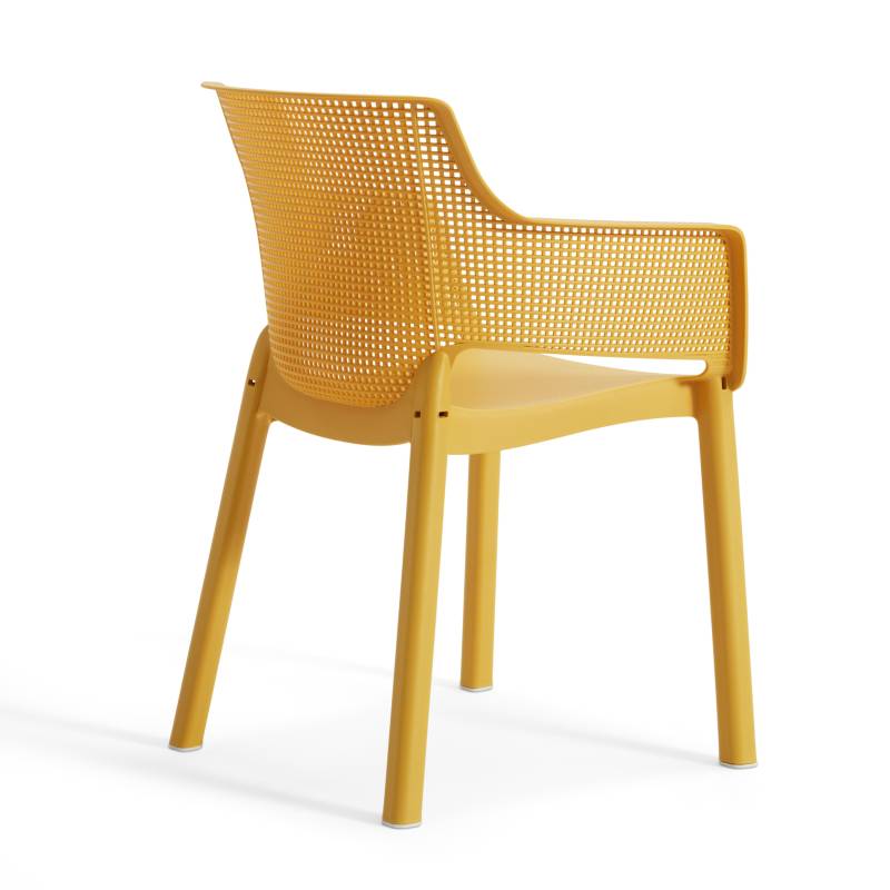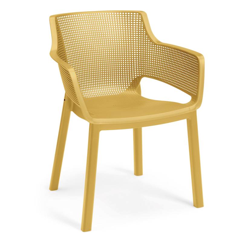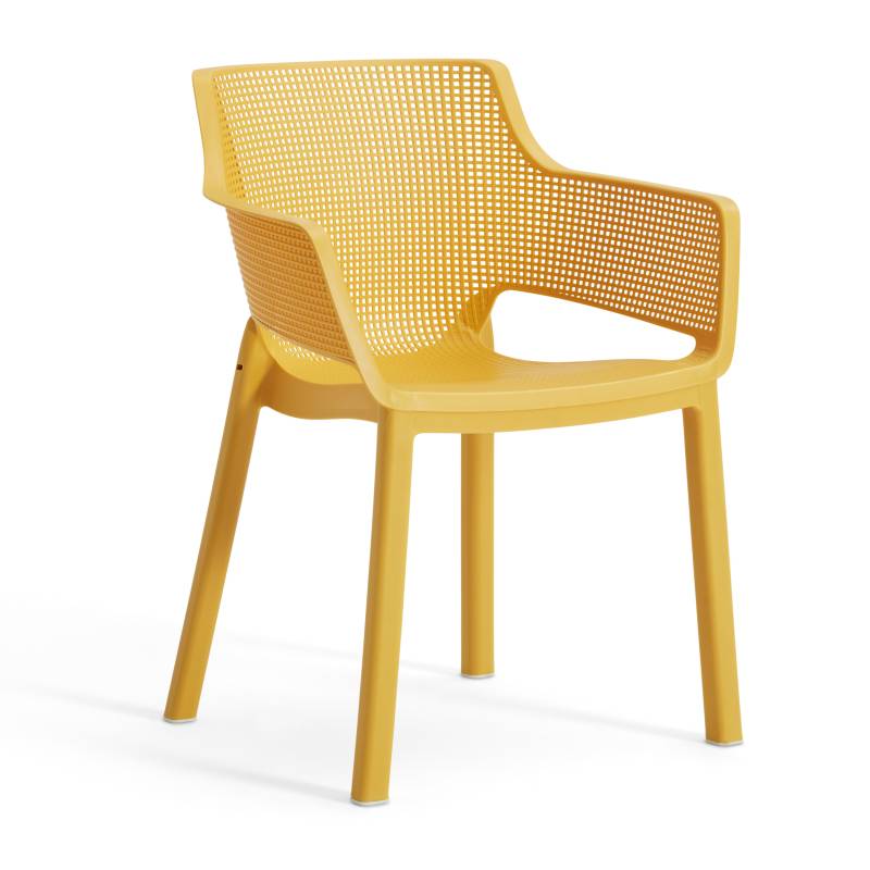 Elisa es una silla moderna y extremadamente cómoda. El respaldo y el asiento perfilados, así como la línea suavemente redondeada de los reposabrazos, son una gran ventaja. Su moderna textura de malla/red es fácil de limpiar y apilable. Ideal para uso en interiores y exteriores.